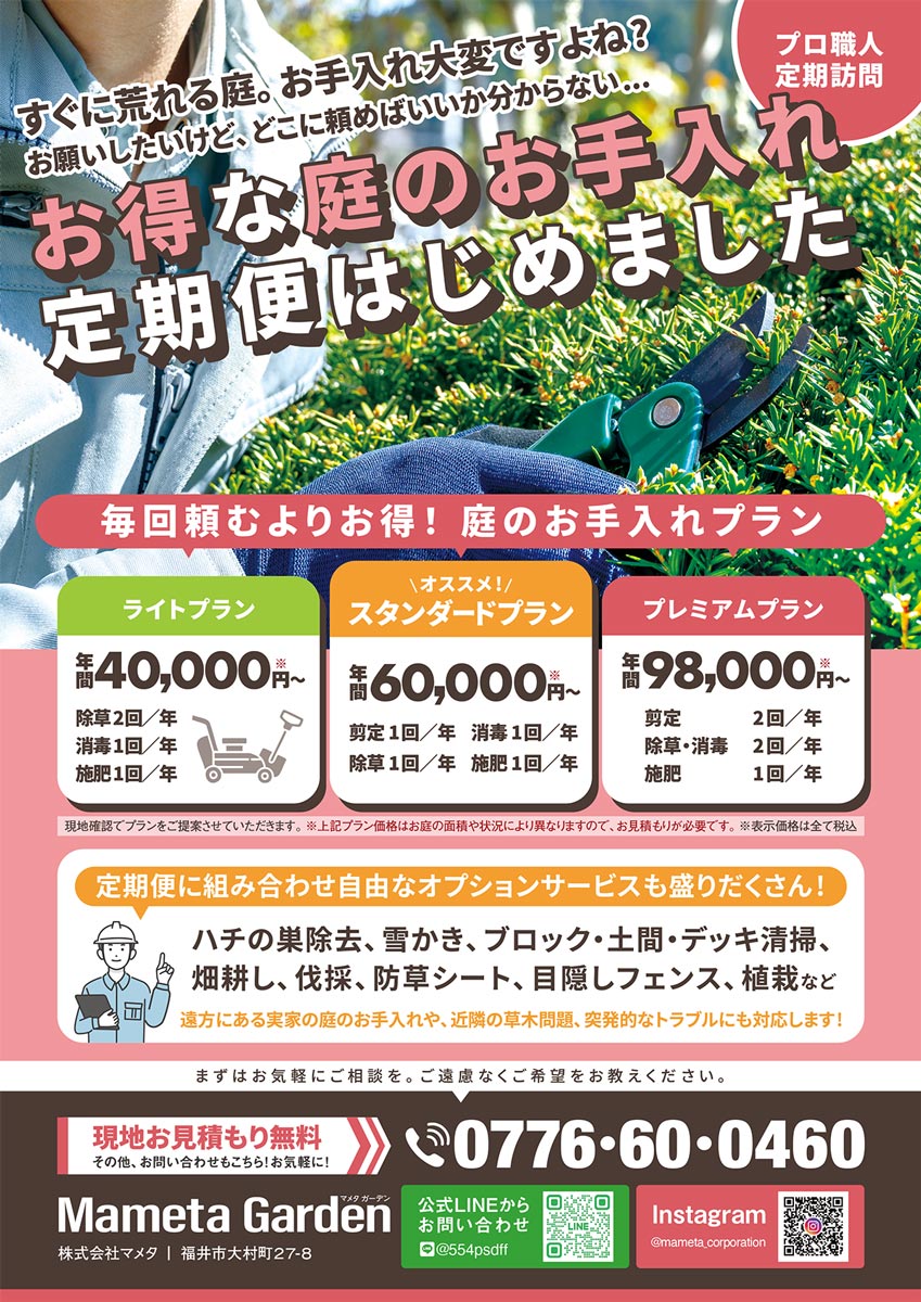 暖かくなると嬉しい反面、お庭の「雑草」や「伸び放題の枝」が気になり始める時期でもあります。